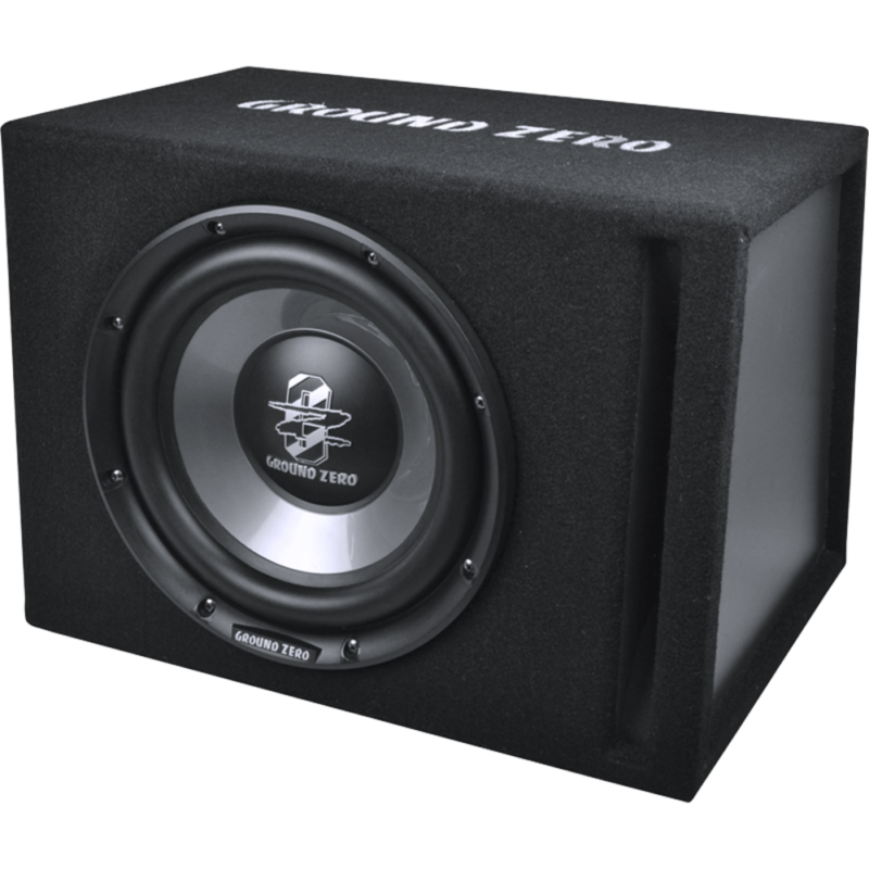 150 Watt RMS Passive vented enclosure including 8″ IRIDIUM subwoofer with EFP front bass channel and angled rear wall 8″ vented subwoofer loaded enclosure Subwoofer GZIW 200X Front vented Wooden enclosure Push terminal