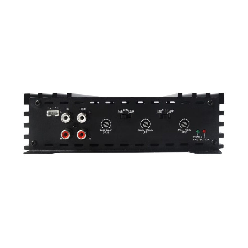 ShockWave 2Channel Amplifier SA-5002 2CHANNEL Features 1) High efficiency A/B Class design 2) Thermal, Overload, Speaker short protection 3) Variable Low pass filter 4) Variable High pass filter 5) Adjustable input sensitivity 6) RCA low lever inputs 7) Aluminum alloy heatsink Specifications 1) 4 Ohm RMS power: 85Watts x 2 2) 2 Ohm RMS power: 120Watts x 2 3) 4 Ohm Bridged power: 240Watts x 1 4) Frequency response: 20Hz – 30KHz