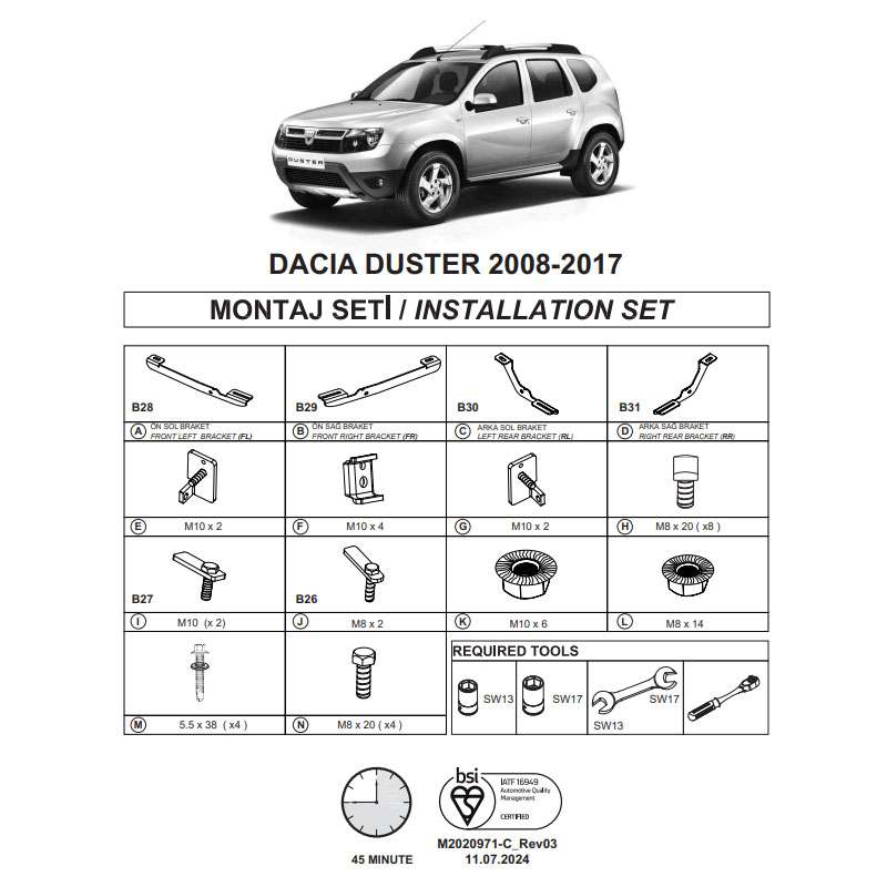Βάσεις Πλαινών Σκαλοπατιών (Alm-Sr-Rl-Ln-Da) Για Dacia Duster 2010-2018 Suv HsΟι βάσεις στήριξης για τα πλάγια σκαλοπάτια μας έχουν σχεδιαστεί ειδικά για κάθε μοντέλο οχήματος, ώστε να εξασφαλίζεται τέλεια εφαρμογή και εύκολη εγκατάσταση. Δεν απαιτείται τρύπημα ή κοπή, καθώς χρησιμοποιούν τα υπάρχοντα σημεία στήριξης στο πλαίσιο. Κατασκευασμένες από υψηλής ποιότητας, γαλβανισμένο μέταλλο ψυχρής έλασης για μέγιστη ανθεκτικότητα και αντοχή. Κάθε σετ βάσεων δοκιμάζεται για συμβατότητα και υποστηρίζει ικανότητα φορτίου έως και 150 kg.Dacia | Duster | Duster 10-17