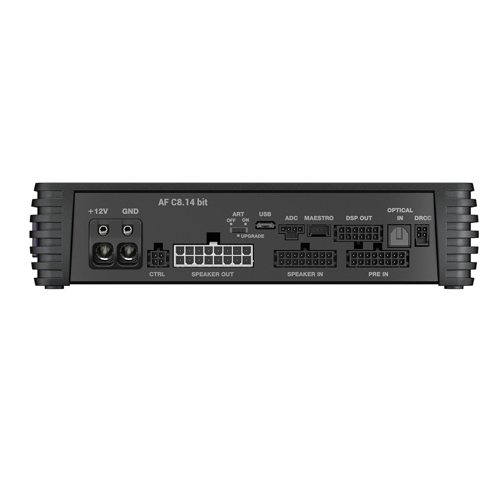 Το AF C8.14 bit διαθέτει οκτώ ενισχυμένα κανάλια υψηλής πιστότητας 65W x 8 @4Ω*, 100W x 8 @2Ω*, με τον ακουστικό ήχο της τελευταίας γενιάς τεχνολογίας Audison D-Class. Οι υψηλότερες συχνότητες μεταγωγής, το πιο απότομο φιλτράρισμα και τα εξαρτήματα υψηλότερης ανοχής προσφέρουν ήχο πάνω και πέρα από τις προσδοκίες της Κατηγορίας D – σε ένα εκπληκτικά συμπαγές πακέτο! Αυτό συνδυάζεται με το εγγενές DSP που λειτουργεί στα 24 bit/96 kHz, επεκτείνοντας τη ζώνη ήχου έως και 40 kHz και κερδίζοντας την πολυπόθητη πιστοποίηση υψηλής ανάλυσης. Η γεφύρωση ζευγών καναλιών έχει ως αποτέλεσμα 200W x 4 @4Ω*, που εγγυάται ευέλικτη και ισχυρή απόδοση. Η υποστήριξη για τη λειτουργία Absolute Volume του Audison B-CON εγγυάται μέγιστο βάθος bit, ακόμη και με ασύρματες συνδέσεις!