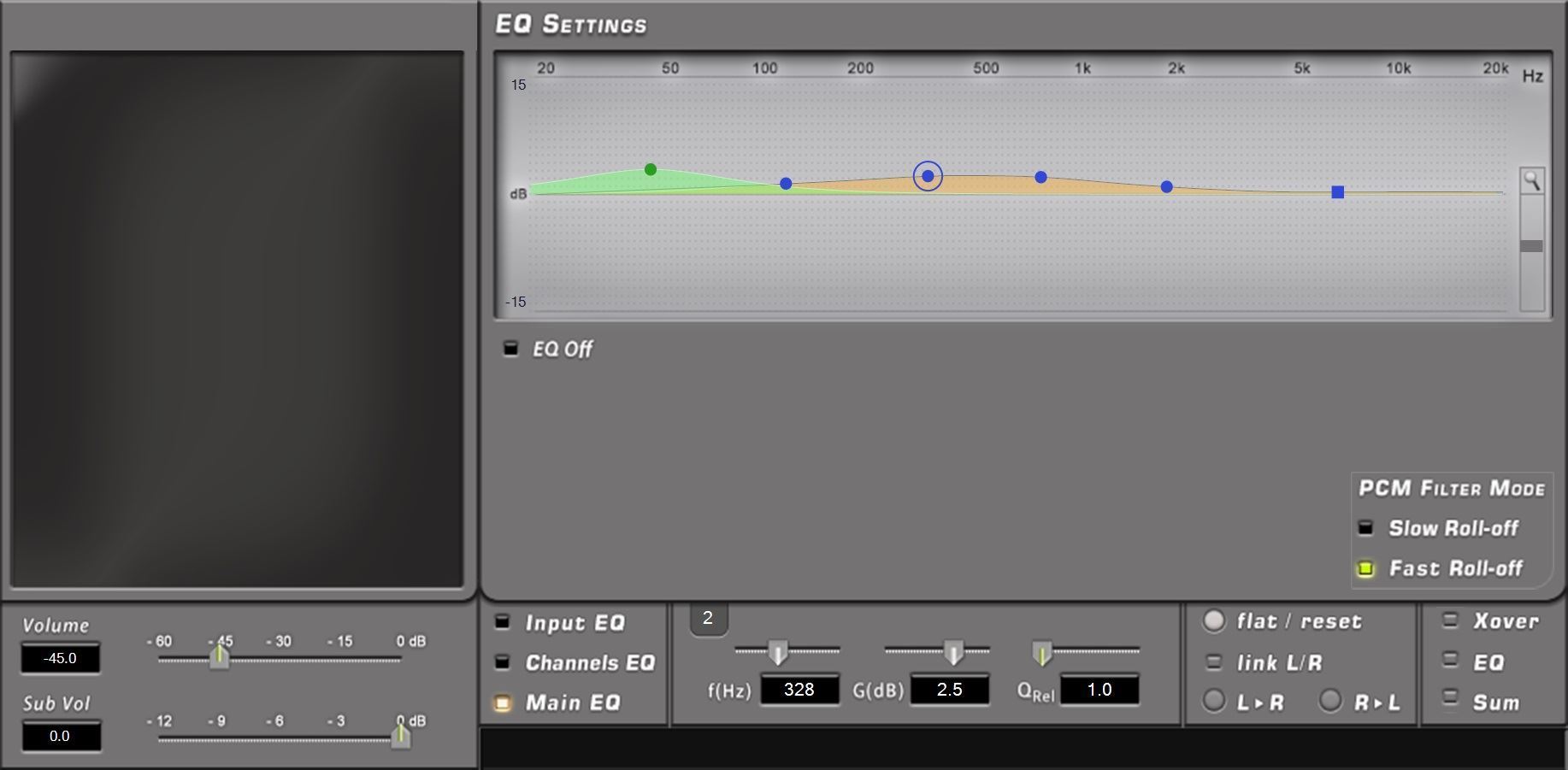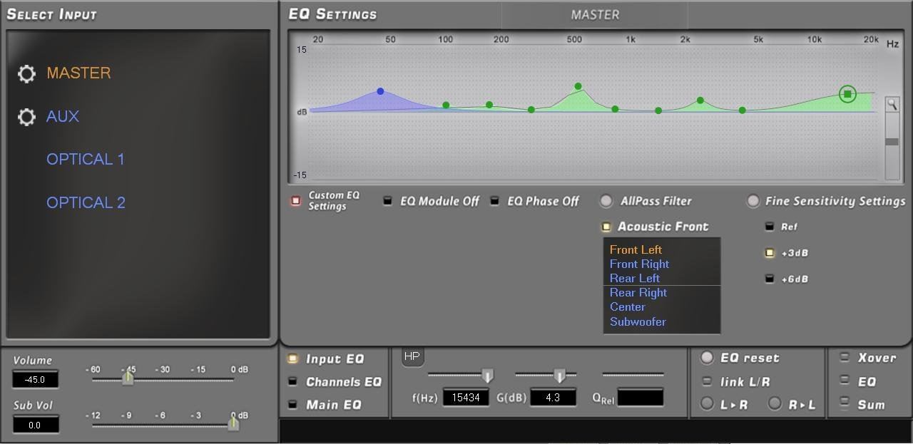| Crossover Frequency | Lo-Pass: 0 ÷ 44k Hz (1 Hz step) Hi-Pass: 0 ÷ 20k Hz (1 Hz step) |