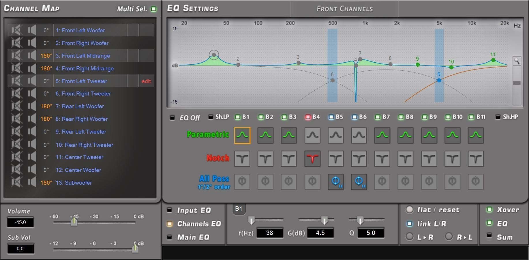 | Filter mode and slope | Linkwitz @ 12 / 24 / 36 / 48 dB Butterworth @ 6 / 12 / 18 / 24 / 30 / 36 /42 / 48 dB Bessel @ 6 / 12 / 18 / 24 / 30 / 36 dB FIR @ 6 / 12 / 18 / 24 / 30 / 36 / 42 / 48 dB |