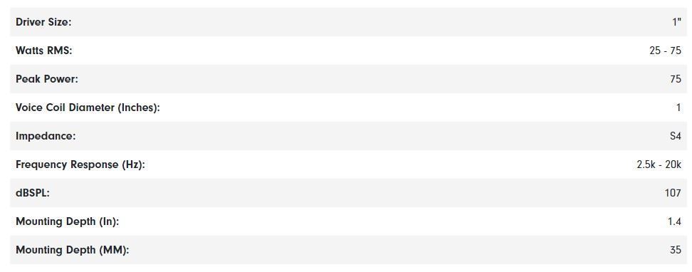 CODE:TRF H WT552SERIOUS: ''H''FREQUENCY:40Hz-25kHzSENSITIVITY: 92dB/W/MPEAK POWER: 220WRMS POWER: 75WIMPEDANCE: 4ohmVΟΙCE COIL: 25mmMAGNET WOOFER:ferritysMAGNET TWEETER:NEO(NEOΔΥΜΙΟΥ)SIZE WOOFER: 5.25"(135cm)SIZE TWEETER: 46mm Mylar DomeMATERIAL CONE: MIX PAPER AND WOOD FIBERMATERIAL TWEETER: Silk Dome