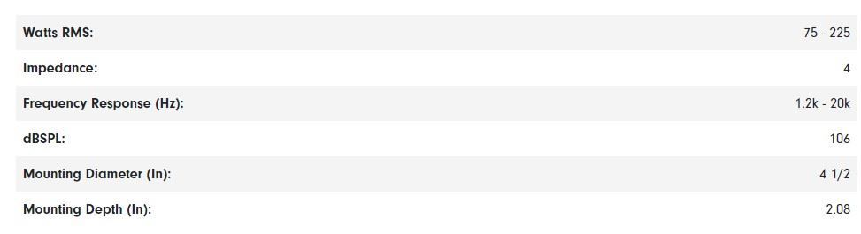 Specifications:Model code: TRF SB388ND X 2GNominal diameter: 4.13"(105mm)Ohmic resistance: 8 ohmsPower watt MAX: 400WPower watt RMS: 200WSensitivity (1w / 1m): 112 dBFrequency range: 4KHZ-20KHzVoice coil diameter: 1.5"Fs: 4KHzRe (D.C.): 5.8 ΩVoice coil wire: CCAWVoice coil FORMER: HEXATECH ALUMINUM 1.5 ''Magnet: NEODYMIUMMagnet dimension: Φ90 * 6 mmNet weight: 1.098 kgDimension: 10.7x7.1CM