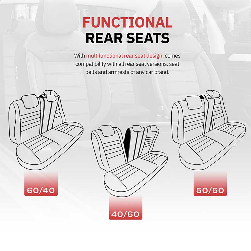 Καλύμματα Αυτοκινήτου Otom Comfortline Design Universal Sued / Rachel / Δερματίνη Σετ Εμπρός / Πίσω 11 Τεμαχίων Μαύρο Με Κόκκινο Ρέλι CMF-218Καλύμματα καθισμάτων για το αυτοκίνητο Universal, από υψηλής ποιότητας Δερματίνη σε συνδυασμό με Sued ύφασμα . Προστατεύουν από λεκέδες, καθημερινή φθορά και διατηρούν τα καθίσματα του αυτοκινήτου στην αρχική τους όψη. Καθαρίζονται και τοποθετούνται εύκολα! Breathable Fabric : Kατασκευασμένα από 3 στρώσεων μη καρκινογόνα υλικά, διαπνέον ύφασμα και σφουγγάρι 5mm στο μεσαίο τμήμα και 4mm στα άκρα , συνδυάζουν την άνεση, υψηλή ποιότητα και την αντοχή στην χρήση.Extra Supportive 7 Layers : Ορθοπεδικός σχεδιασμός 7 στρώσεων στα πλαϊνά ώστε να παρέχεται στήριξη στην πλάτη και τη μέση . Προλαμβάνει τον πόνο και αυξάνει την οδηγική άνεση.Aerofit Tech : Σχεδιασμένα με την τεχνολογίαAerofit για να καλύπτουν το κάθισμα με τέλεια εφαρμογή 360°.Special Airbag Stitch : Κατάλληλα για καθίσματα εξοπλισμένα με πλευρικούς αερόσακους, καθώς ακολουθούν τα Ευρωπαϊκά στάνταρ, για πιο ασφαλής οδήγηση.Zip-up Tech : Διαθέτει 3 Φερμουάρ ώστε να προσαρμόζεται στα πίσω καθίσματα είτε είναι διαιρούμενα 60-40 είτε 40-60 είτε 50-50. Προσαρμόζεται επίσης πλήρως στις ζώνες ασφαλείας και στο υποβραχιόνιο στα πίσω καθίσματα .