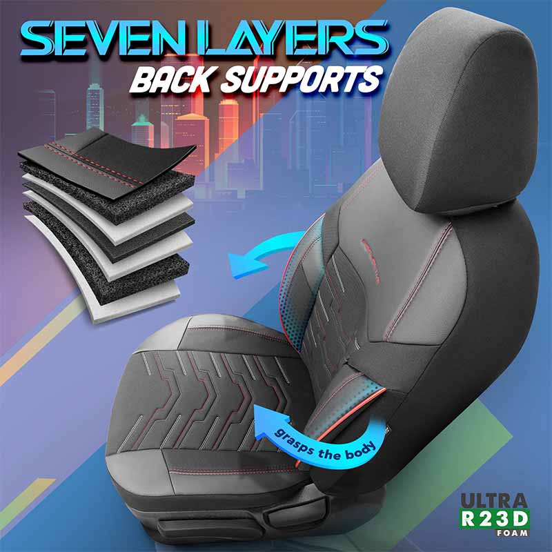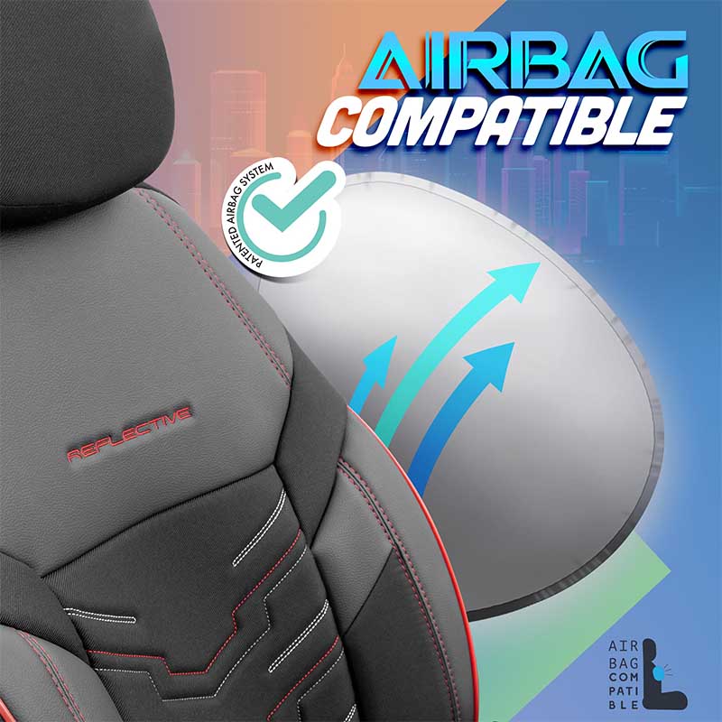 Καλύμματα Αυτοκινήτου Otom Reflective Design Universal Jacquard / Rachel / Δερματίνη Σετ Εμπρός / Πίσω 11 Τεμαχίων Μαύρο Με Κόκκινη Ραφή RFL-2601Καλύμματα καθισμάτων για το αυτοκίνητο Otom Reflective Design Universal, από υψηλής ποιότητας Δερματίνη σε συνδυασμό με Jacquard / Rachel ύφασμα . Προστατεύουν από λεκέδες, καθημερινή φθορά και διατηρούν τα καθίσματα του αυτοκινήτου στην αρχική τους όψη. Καθαρίζονται και τοποθετούνται εύκολα! Breathable Fabric : Kατασκευασμένα από 3 στρώσεων μη καρκινογόνα υλικά, διαπνέον ύφασμα και σφουγγάρι 5mm στο μεσαίο τμήμα και 4mm στα άκρα , συνδυάζουν την άνεση, υψηλή ποιότητα και την αντοχή στην χρήση.Extra Supportive 7 Layers : Ορθοπεδικός σχεδιασμός 7 στρώσεων στα πλαϊνά ώστε να παρέχεται στήριξη στην πλάτη και τη μέση . Προλαμβάνει τον πόνο και αυξάνει την οδηγική άνεση.Aerofit Tech : Σχεδιασμένα με την τεχνολογίαAerofit για να καλύπτουν το κάθισμα με τέλεια εφαρμογή 360°.Airbag Compatible : Κατάλληλα για καθίσματα εξοπλισμένα με πλευρικούς αερόσακους, για πιο ασφαλής οδήγηση.Zip-up Tech : Διαθέτει 3 Φερμουάρ ώστε να προσαρμόζεται στα πίσω καθίσματα είτε είναι διαιρούμενα 60-40 είτε 40-60 είτε 50-50. Προσαρμόζεται επίσης πλήρως στις ζώνες ασφαλείας και στο υποβραχιόνιο στα πίσω καθίσματα . Multi Functional Pockets : Οι πλάτες των μπροστινών καλυμμάτων είναι εφοδιασμένες με θήκες για αποθήκευση των προσωπικών σας αντικειμένων κατά την διαδρομή. Σχεδιαμένα για universal εφαρμογή. Κατάλληλα για τους περισσότερους τύπους αυτοκινήτων .
