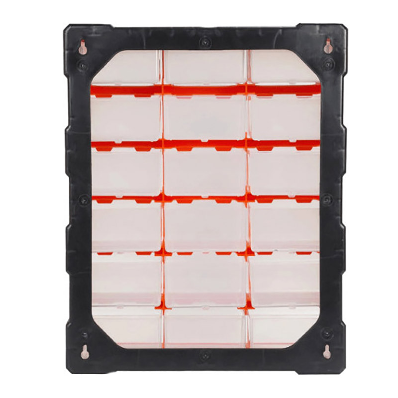 Με 18 μεγάλα πλαστικά διάφανα συρτάρια από ΡΡ (πολυπροπυλενιο) (113x152x58.4mm)