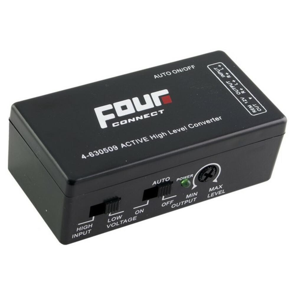 FOUR Connect 4-630509 is a 2-channel active High / low converter. Connect it to two speaker lines and get 2 RCA outputs AND remote output to your amplifier. THis product has a level control that will help you a lot when installing a subwoofer and amp to your existing system. Many times Signal level is too low for subwoofer amp without level adjustment. This causes a problem, because main speakers play too loud and subwoofer level is not enough. With level control you can solve this problem and make your subwoofer loud enough!