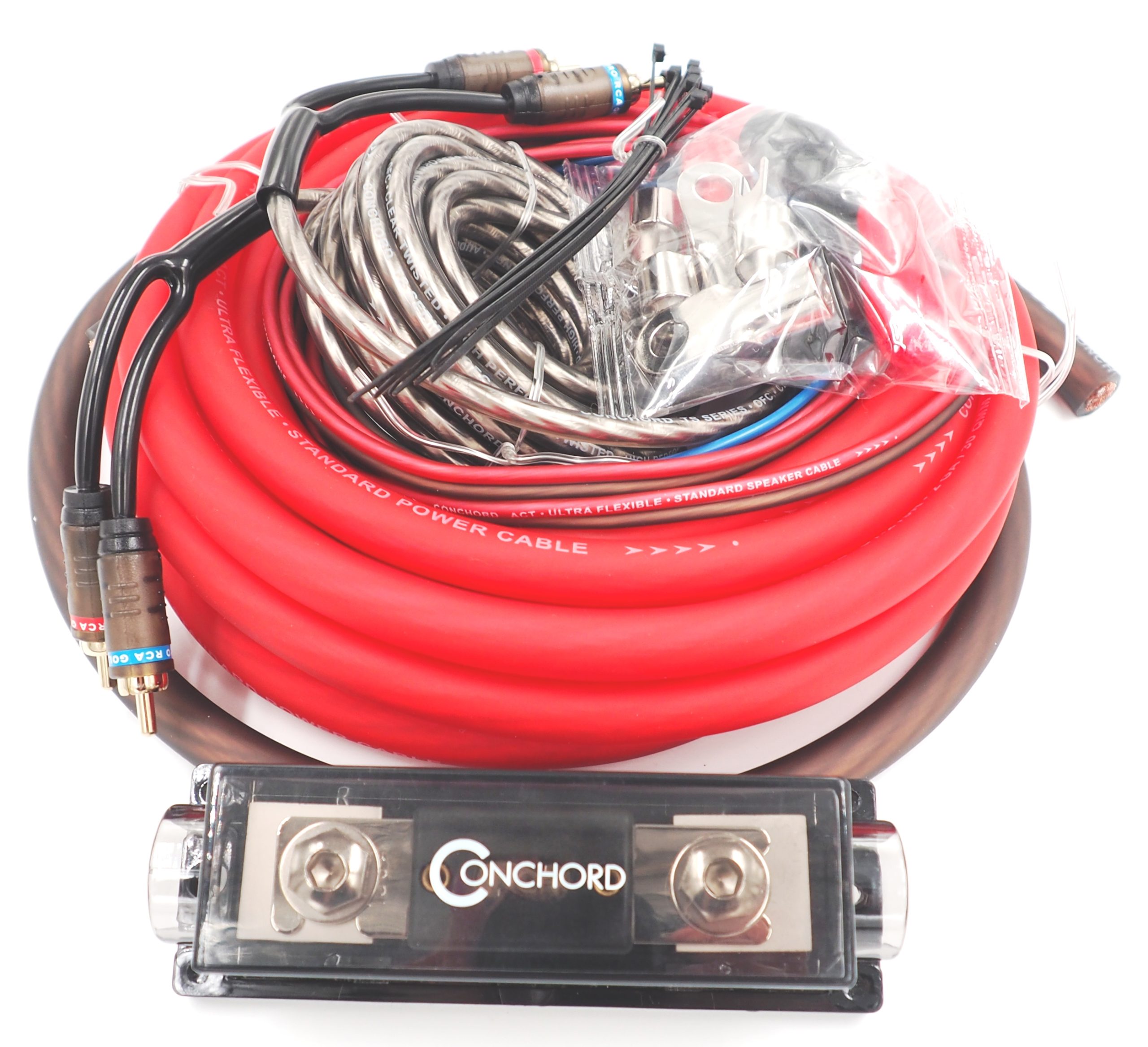 1m Power Cable brown 2G ultra flexible 5m Power Cable red 2G ultra flexible 6m Speaker Cable 2 X 1,5 red / black 1 RCA 5m , ring connectors,5m 1 x 0,5 mm2 Remote Cable blue 1 Fusehold with ANL fuse 150 A,10pieces Tyre up