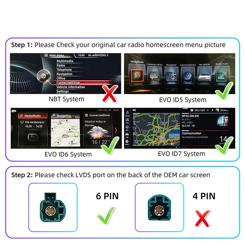 Συμβατότητα με το BMW EVO MGUΕπαληθεύστε εάν η BMW σας είναι συμβατή με το κουτί αποκωδικοποίησης CarPlay μας ελέγχοντας το σύστημα (EVO ID5/ID6/ID7) και τη θύρα LVDS (6 – PIN) BMW EVO MGU CompatibilityVerify If Your BMW Is Compatible with Our CarPlay Decoder Box by Checking System (EVO ID5/ID6/ID7) and LVDS Port (6 – PIN) |