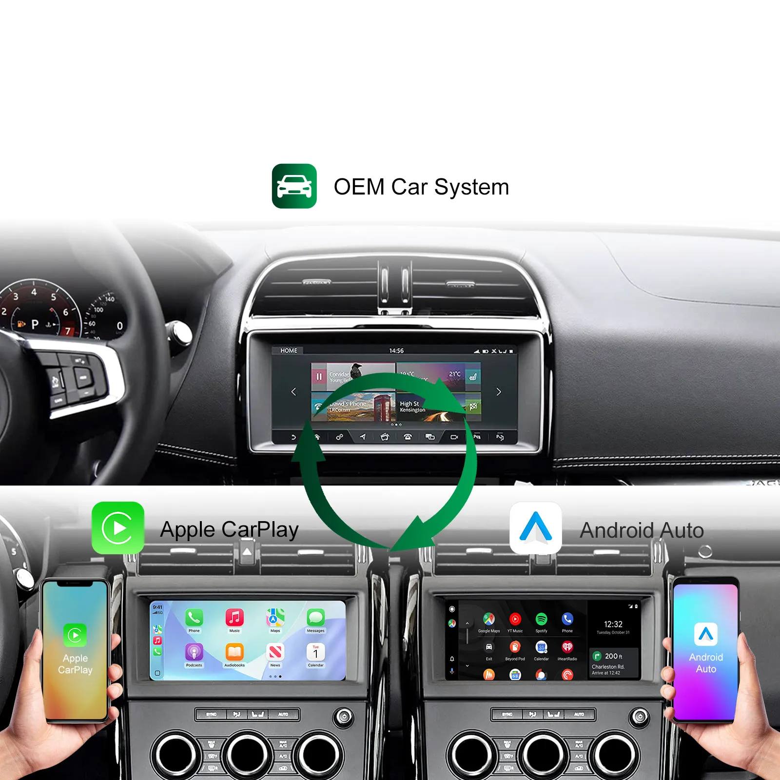 Interface Box για ασύρματο Apple Car Play, Android Auto, Screen Mirrorink, Bluetooth, USB Player & Κάμερα για αυτοκίνητα Jaguar – Land Rover 2016-2019 με εργοστασιακό σύστημα Harman, συμβατό με οθόνες 10.25 ιντσών, διατηρώντας όλες τις εργοστασιακές ενδείξεις του ηχοσυστήματος στην οθόνη του αυτοκινήτου με πλήρη ενσωμάτωση των εργοστασιακών χειριστήριων του αυτοκινήτου.