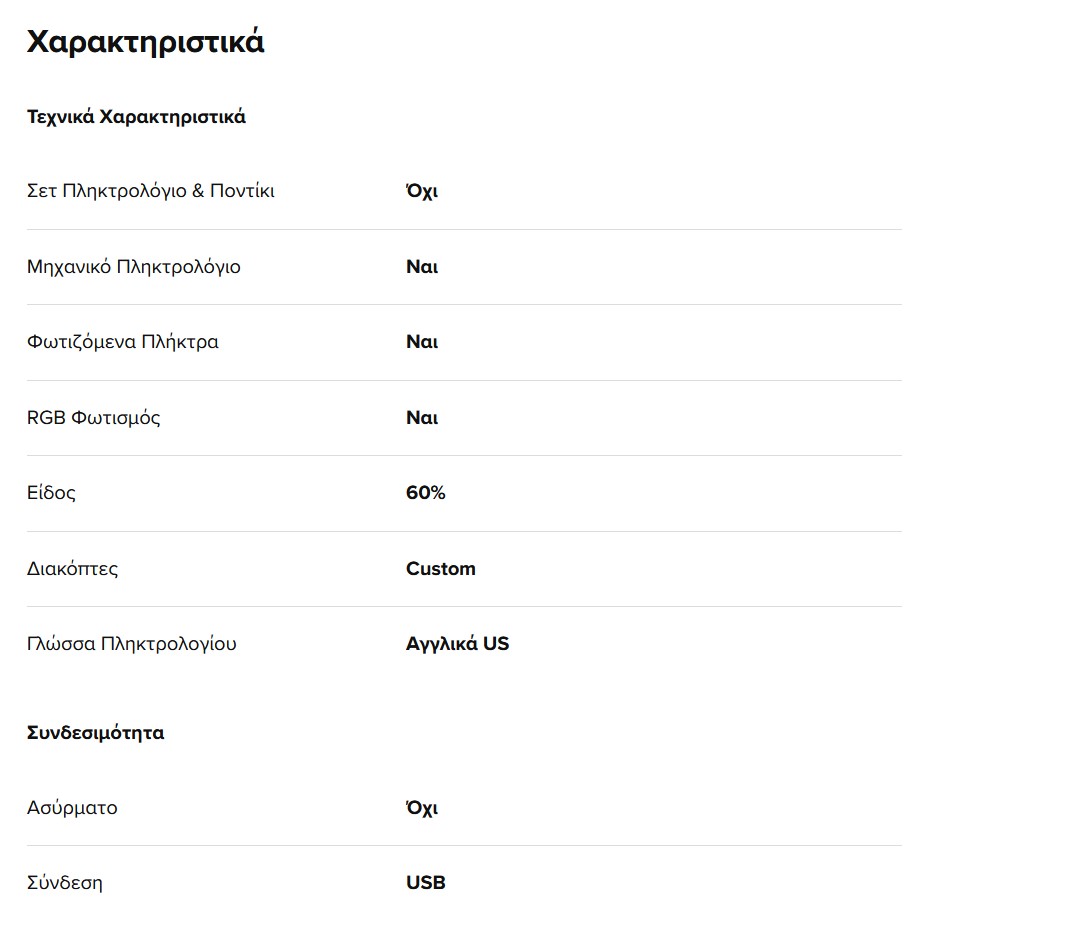 Gaming πληκτρολόγιο της εταιρείας Havit με RGB φωτιζόμενα πλήκτρα σε γλώσσα αγγλικά US. Είναι μηχανικό, καθιστώντας το ιδανικό για gamers όπως επίσης και για όσους επιθυμούν γρήγορη πληκτρολόγηση. Έχει γρήγορη απόκριση και ακρίβεια, καθώς οι διακόπτες του ενεργοποιούνται στα μισά του πατήματος, εξοικονομώντας κινήσεις όταν πληκτρολογούμε. Σε σύγκριση με τα πληκτρολόγια μεμβράνης, αντέχουν περισσότερο στο χρόνο, έχουν όμως το μειονέκτημα του θορύβου που είναι πολλές φορές ενοχλητικό για τους γύρω. Έχει το 60% του μεγέθους ενός τυπικού keyboard, απαιτεί λιγότερο χώρο στο γραφείο και δεν διαθέτει αριθμητικά πλήκτρα στο δεξί μέρος του.