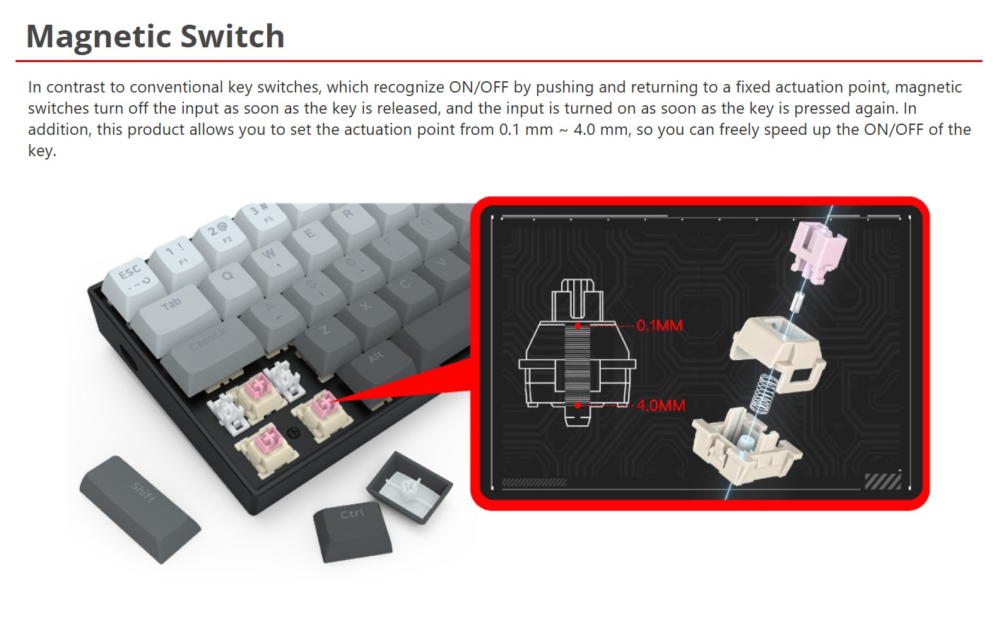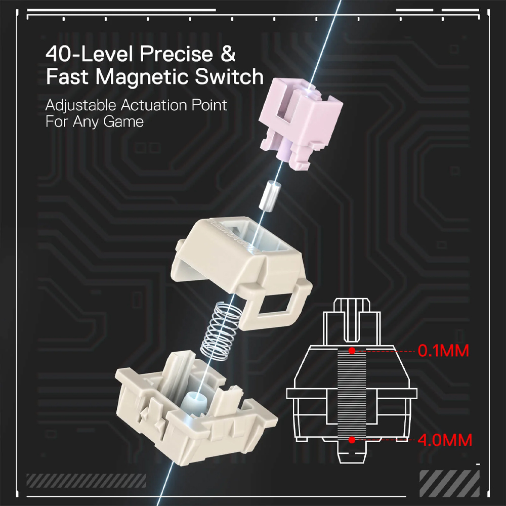 - Rapid Trigger Tech – Συνδυάστε τον μαγνητικό διακόπτη Hall με την ταχεία ενεργοποίηση μέσω λογισμικού, το σημείο ενεργοποίησης μπορεί να ρυθμιστεί με ακρίβεια 0,1 mm μεταξύ 0,1-4,0 mm, ο συνδυασμός εξαιρετικά ακριβούς σημείου ενεργοποίησης 40 επιπέδων με δυναμική ενεργοποίηση/απενεργοποίηση καθορίζει το πάτημα μας.