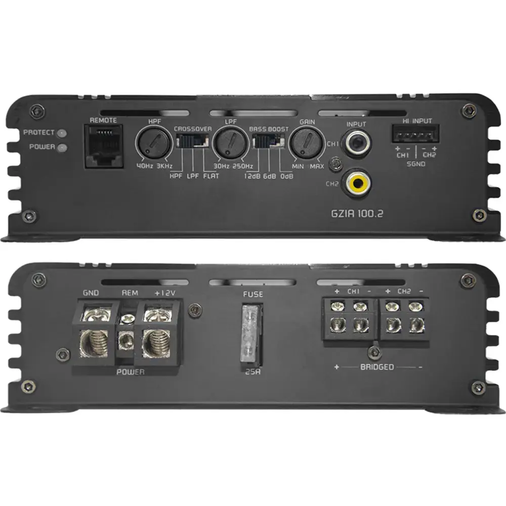 - Type High power class A/B amplifier Channels 2 Output Power (@ 4Ω) 2x 75 Watts RMS Output Power (@ 2Ω) 2x 120 Watts RMS max. Output Power (CEA-2006A / 10%THD+N) 300 Watts Ouput power (@ 4Ω) bridged 240 Watts RMS Frequency Response 8 Hz – 28 kHz HPF / LPF / BPF ● / ● / ○ Bass Boost / Phase Shift ● / ○ High-Level Input / Auto-on ● / ● Remote Control included BIAS Setting ○ Linkmode ○ Dimensions (w x h x L) 168 x 49 x 175 mm / 6.61″ x 1.93″ x 6.89″