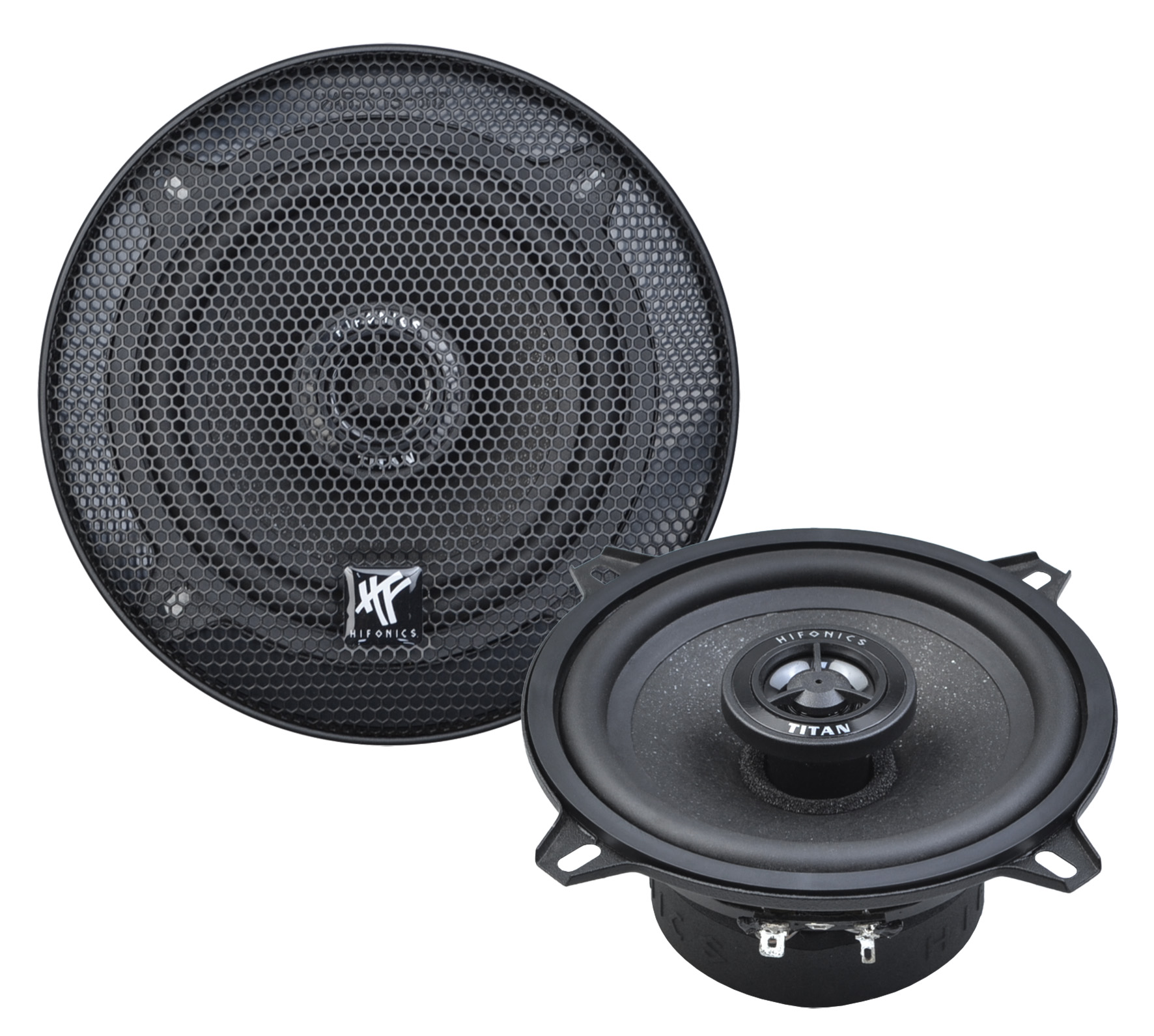 TITAN coaxial speakers with powerful sound have a very long tradition in the HiFonics loudspeaker range. The very good sound quality and durability, which also astonishes with an excellent price-performance ratio, have always been particularly valued. But standing still is not an option in the world of sound technology either. That is why the HiFonics developers have given the models a complete makeover and combined them with innovative materials. The result is a sound that not only retains the audiophile charm of the Titan loudspeakers, but surpasses it in many details. The newly used composite membranes made of a MICA/paper mixture, which have proven to be superior in terms of sound to the previous membranes in many listening tests, make a significant contribution to improving the sound of the new TITAN TRX loudspeakers. Thanks to the ultra-light, very stable and excellently dampening MICA membrane composition, bass and mid frequencies are always reproduced precisely and powerfully and distortion is minimized. The sound always remains neutral, clear and balanced. This means that every piece of music is reproduced in its full detail and dynamics. Specifications 13 cm (5.25″) 2-Way Coaxial Speakers 75 W/RMS, 150 W/MAX, 4 Ω Frequency Range 65 – 22000 Hz 13 mm Mylar Neodymium Tweeters Protection Grille Ø 115 mm, ‡ 54 mm Downloads Owner’s Manual