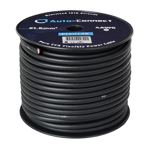 PC21CCAB is an extremely flexible power wire for automotive use. Made from CCA (copper-clad aluminium), this wire ensures a great price-to-performance ratio with solid power transfer. It features an oversized 21.6 mm² CCA conductor with a soft, flexible PVC insulation that makes the wire easy to use and route in your vehicle.