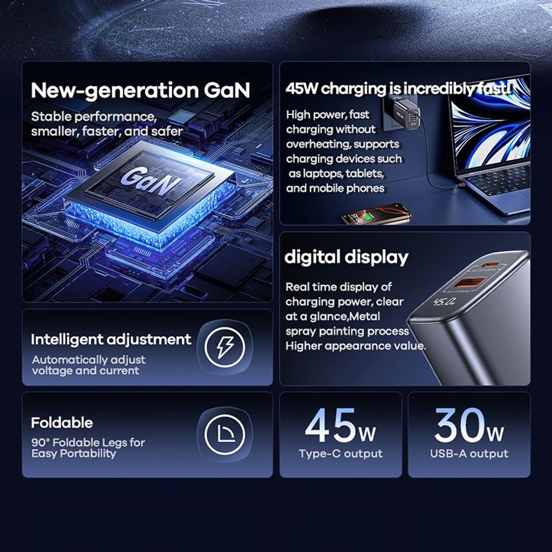 45W GaN Digital Display Fast Charging Adapter Laptop Tablet Phone Type-C USB-A Charger
