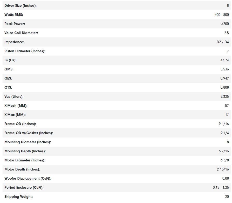DD Audio is know for industry leading subwoofer innovations, and the 2508 is loaded with our latest state of the art performance based features that clearly separate it from any other subwoofer on the planet.The 2508 is the first DD Audio subwoofer with ESP. ESP stands for Evolution Subwoofer Package, and it will completely change the game when it comes to high performance subwoofers. ESP equipped subs will feature a culmination of what we’ve learned from over 25 years of building high performance drivers. Every part in our ESP subs is exclusive to DD Audio. By custom tooling every part that goes into an ESP woofer we’re able to overcome many issues faced by using standard designs. ESP Features: True Size Carbon Fiber Blend Cone (CFB) – True size cone geometry allows for more cone area and bass output from a given box size while staying in designated size classes. The CFB composition employs a potent carbon fiber based cocktail to give you the highest strength to weight ration of any pulp cone in the industry. Vario-density Extended Range Of Motion Surround (V-ROM) – Provides the ultimate in linear control at high excursion while still allowing for dynamic sounding bass reproduction. Tuned Composite Spider System (CSS) – Each suspension is tuned for specific performance traits with spiders using mixtures of laminated cloth layers over a compressed rubber core for extended life and smoother linear travel. DD Super Frame (Sframe)- We designed new these frame geometries to maximize the spider diameter, cone diameter, suspension excursion, and to work as an outer shorting ring for the motor while maximizing heat sinking and heat flow from the coil. The technologically advanced 2508 combines what were previously impossible elements into an 8″ package. It was designed with the excursion and power handling of a larger diameter woofer enabling it to make maximum acoustic energy in space constrained applications. This groundbreaking subwoofer delivers True To The Source sound at ultra low distortion levels that you have to hear to believe.