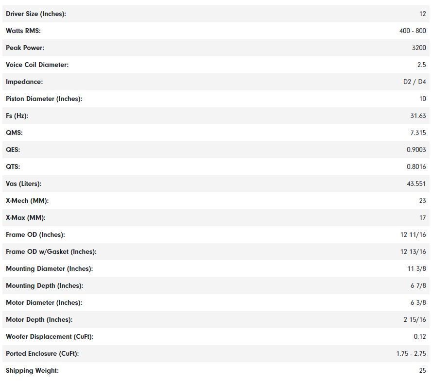 DD Audio is know for industry leading subwoofer innovations, and the 2508 is loaded with our latest state of the art performance based features that clearly separate it from any other subwoofer on the planet.The 2508 is the first DD Audio subwoofer with ESP. ESP stands for Evolution Subwoofer Package, and it will completely change the game when it comes to high performance subwoofers. ESP equipped subs will feature a culmination of what we’ve learned from over 25 years of building high performance drivers. Every part in our ESP subs is exclusive to DD Audio. By custom tooling every part that goes into an ESP woofer we’re able to overcome many issues faced by using standard designs. ESP Features: True Size Carbon Fiber Blend Cone (CFB) – True size cone geometry allows for more cone area and bass output from a given box size while staying in designated size classes. The CFB composition employs a potent carbon fiber based cocktail to give you the highest strength to weight ration of any pulp cone in the industry. Vario-density Extended Range Of Motion Surround (V-ROM) – Provides the ultimate in linear control at high excursion while still allowing for dynamic sounding bass reproduction. Tuned Composite Spider System (CSS) – Each suspension is tuned for specific performance traits with spiders using mixtures of laminated cloth layers over a compressed rubber core for extended life and smoother linear travel. DD Super Frame (Sframe)- We designed new these frame geometries to maximize the spider diameter, cone diameter, suspension excursion, and to work as an outer shorting ring for the motor while maximizing heat sinking and heat flow from the coil. The technologically advanced 2508 combines what were previously impossible elements into an 8″ package. It was designed with the excursion and power handling of a larger diameter woofer enabling it to make maximum acoustic energy in space constrained applications. This groundbreaking subwoofer delivers True To The Source sound at ultra low distortion levels that you have to hear to believe.