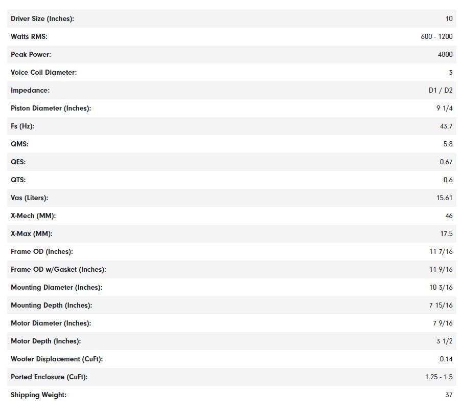 DD Audio is know for industry leading subwoofer innovations, and the 2508 is loaded with our latest state of the art performance based features that clearly separate it from any other subwoofer on the planet.The 2508 is the first DD Audio subwoofer with ESP. ESP stands for Evolution Subwoofer Package, and it will completely change the game when it comes to high performance subwoofers. ESP equipped subs will feature a culmination of what we’ve learned from over 25 years of building high performance drivers. Every part in our ESP subs is exclusive to DD Audio. By custom tooling every part that goes into an ESP woofer we’re able to overcome many issues faced by using standard designs. ESP Features: True Size Carbon Fiber Blend Cone (CFB) – True size cone geometry allows for more cone area and bass output from a given box size while staying in designated size classes. The CFB composition employs a potent carbon fiber based cocktail to give you the highest strength to weight ration of any pulp cone in the industry. Vario-density Extended Range Of Motion Surround (V-ROM) – Provides the ultimate in linear control at high excursion while still allowing for dynamic sounding bass reproduction. Tuned Composite Spider System (CSS) – Each suspension is tuned for specific performance traits with spiders using mixtures of laminated cloth layers over a compressed rubber core for extended life and smoother linear travel. DD Super Frame (Sframe)- We designed new these frame geometries to maximize the spider diameter, cone diameter, suspension excursion, and to work as an outer shorting ring for the motor while maximizing heat sinking and heat flow from the coil. The technologically advanced 2508 combines what were previously impossible elements into an 8″ package. It was designed with the excursion and power handling of a larger diameter woofer enabling it to make maximum acoustic energy in space constrained applications. This groundbreaking subwoofer delivers True To The Source sound at ultra low distortion levels that you have to hear to believe.