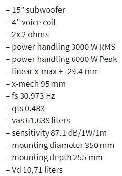 Specifications:Model code: TRF SB388 X 2GNominal diameter: 4.13"(105mm)Ohmic resistance: 8 ohmsPower watt MAX: 350WPower watt RMS: 175WSensitivity (1w / 1m): 111 dBFrequency range: 2.8KHz-20KHzVoice coil diameter: 1.5"Fs: 2.8KHzRe (D.C.): 5.8 ΩVoice coil wire: CCAWVoice coil FORMER: HEXATECH ALUMINUM 1.5''Magnet: FerriteMagnet dimension: Φ90 * 6 mmNet weight: 1.098 kgDimension: 10.7x7.1CM