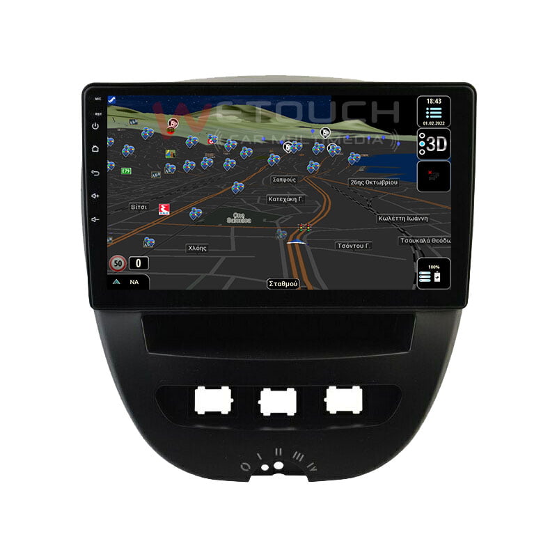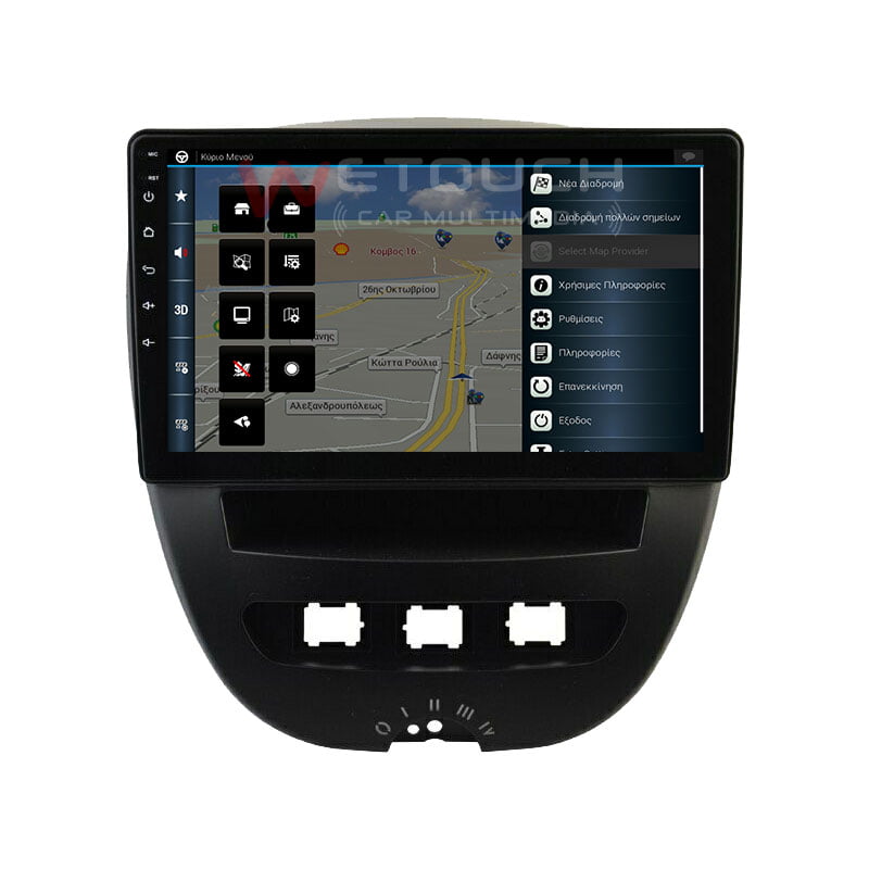 Οθόνη Toyota Aygo Citroen C1 Peugeot 107 multimedia με ενσωματωμένο σύστημα πλοήγησης (χωρίς ίντερνετ) με ελληνική γλώσσα, φωνή & χάρτες. Η οθόνη της Wetouch έχει πλήρη συμβατότητα με τα χειριστήρια τιμονιού και τις εργοστασιακές λειτουργίες των μοντέλων που ταιριάζει, ενώ διαθέτει λογισμικό Android, λειτουργία αφής και κουμπιά για γρήγορη μετάβαση σε navigation, bluetooth κ.α. Με τη χρήση bluetooth ο χρήστης δέχεται και πραγματοποιεί κλήσεις με πολύ καλή ποιότητα ήχου και μικροφώνου.
