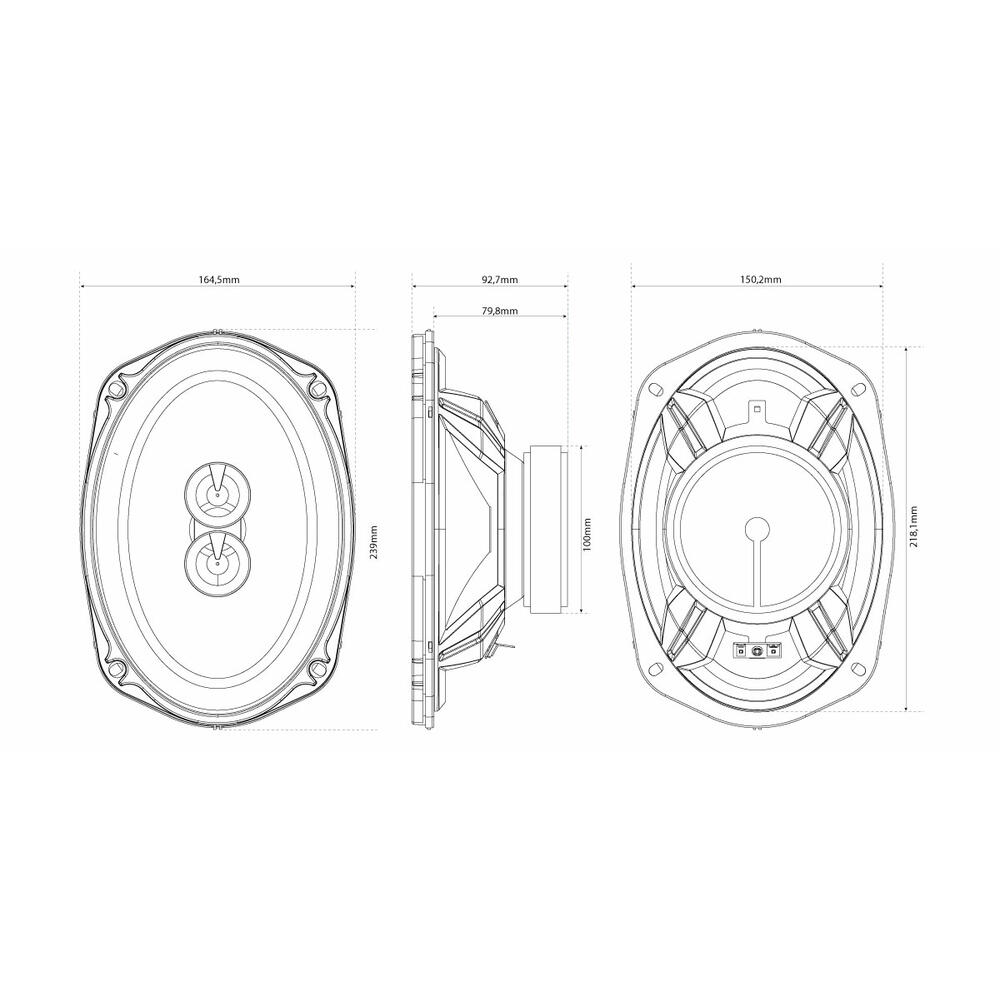 TX269C Specfications 3-way oval coaxial speakers Diameter : 15x23cm (6×9″) Peak Power : 320W RMS Power : 80W Sensitivity : 93,5dB/2,83v/1m Impedance : 4Ω Response : 24Hz – 22000Hz Mounting Depth : 79,8mm Grilles included Features : Injected polypropylene cone with brushed electro-plated finish for a perfect design Laser cut logos for a perfect finish Dual 13mm Mylar tweeter with phase lense for cleaner highs 25mm Aluminium voice coil for a higher power handling Rubber suspension for a perfect reliability Soft and highly musical sound quality